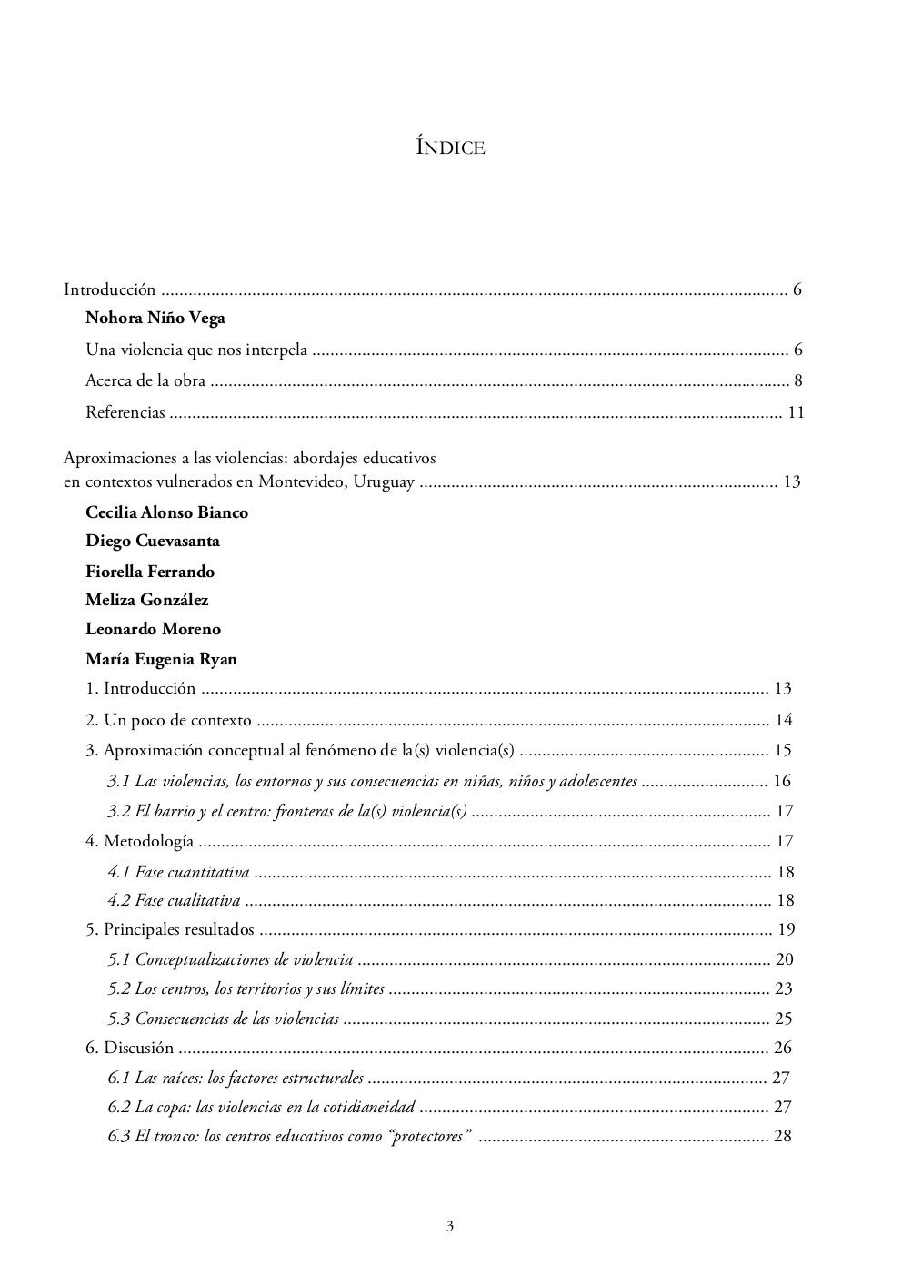 Cada uno de los textos aquí plasmados ubica a las niñas, niños y jóvenes desde el lugar en tanto víctimas de daño, testigos, espectadores o incluso ejecutores de las violencias, mostrando su relevancia como sujetos sociales que valoran sus circunstancias de vida, interpretan y actúan en medio de ellas. Desde diferentes perspectivas teóricas y metodológicas —algunas de carácter mixto y otras netamente cualitativas que incluyen análisis documental, entrevistas a profundidad, investigación acción participativa—, los distintos capítulos revelan importantes cuestiones acerca de la vida de las niñas, niños y jóvenes en los entornos donde residen que resultan violentos. Mientras los dos primeros capítulos comparten hallazgos sobre las situaciones de violencia en Uruguay y Chile, los demás capítulos concentran su trabajo en México.